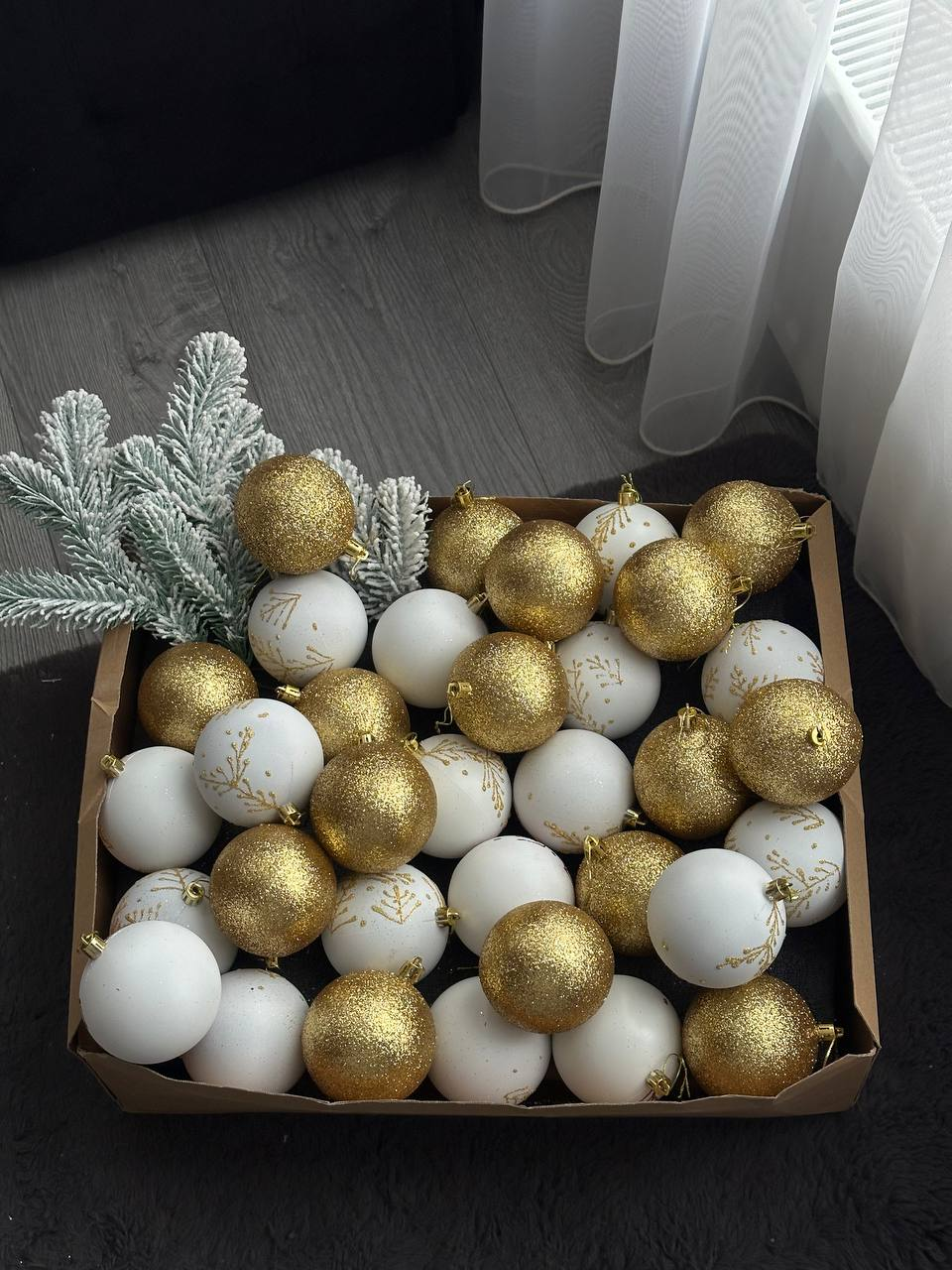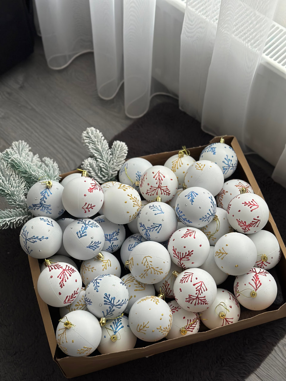 Стильні набори куль у готових поєднаннях кольорів: золото-білий, червоно-білий та синьо-білий. Ідеальні для класичного оформлення ялинки — святкові, яскраві та дуже гармонійні між собою. Матові, глітерні та декоративні кульки з візерунками створюють багатий, об’ємний ефект на ялинці. У наборі — 40 прикрас