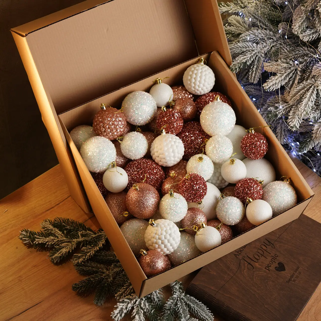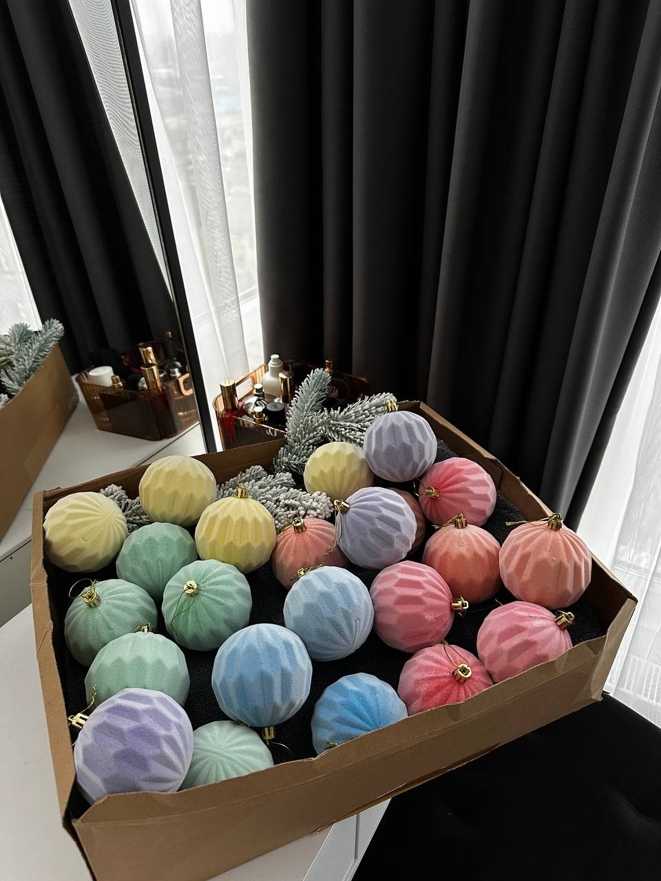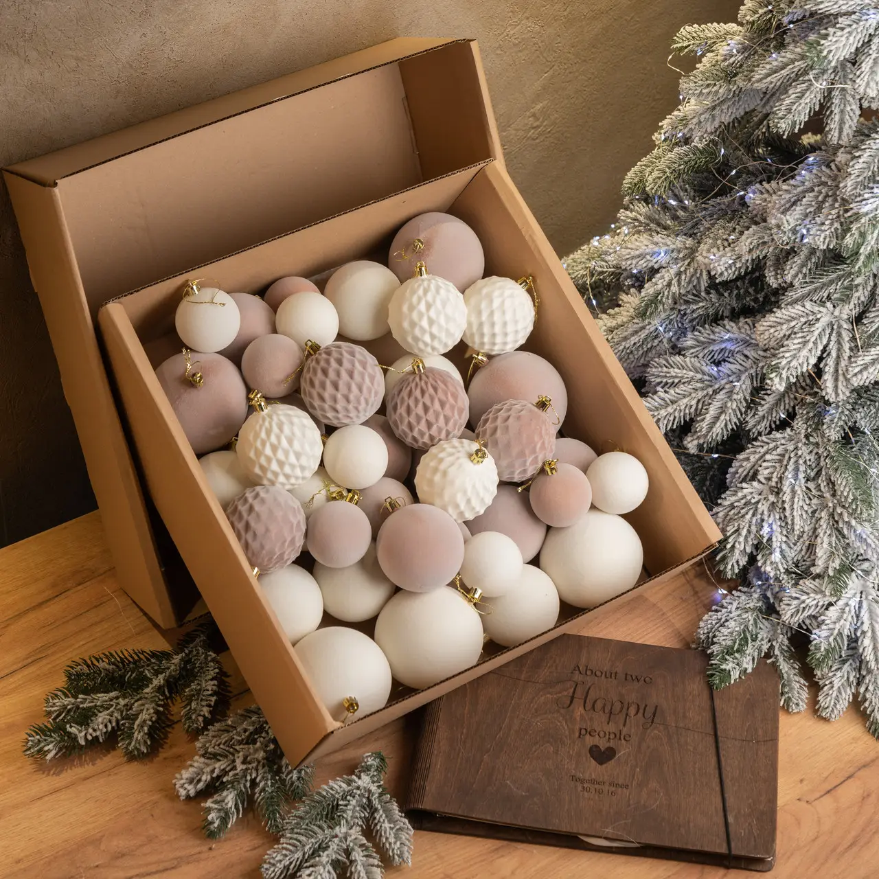 Набір новорічних куль 40 шт. у ніжних тонах. Вишуканий комплект матових та рельєфних куль у трендовій палітрі. Ідеально поєднуються з будь-якою новорічною ялинкою — створюють атмосферу затишку, ніжності й справжнього свята.