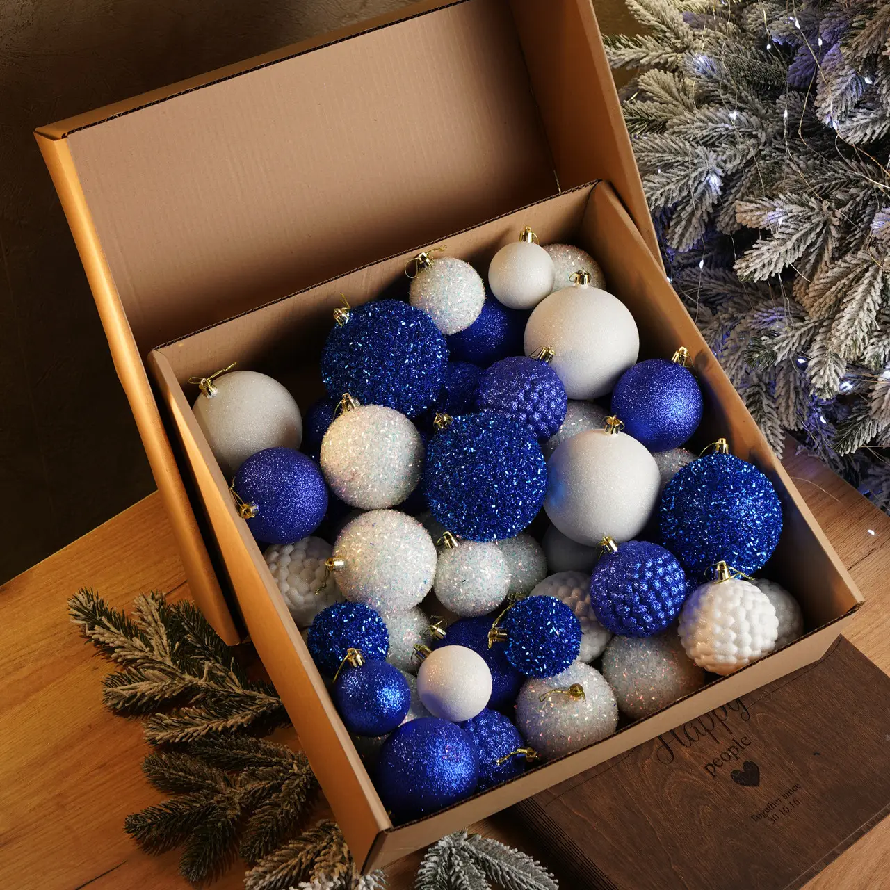 Стильні набори куль у готових поєднаннях кольорів: золото-білий, червоно-білий та синьо-білий. Ідеальні для класичного оформлення ялинки — святкові, яскраві та дуже гармонійні між собою. Матові, глітерні та декоративні кульки з візерунками створюють багатий, об’ємний ефект на ялинці. У наборі — 40 прикрас
