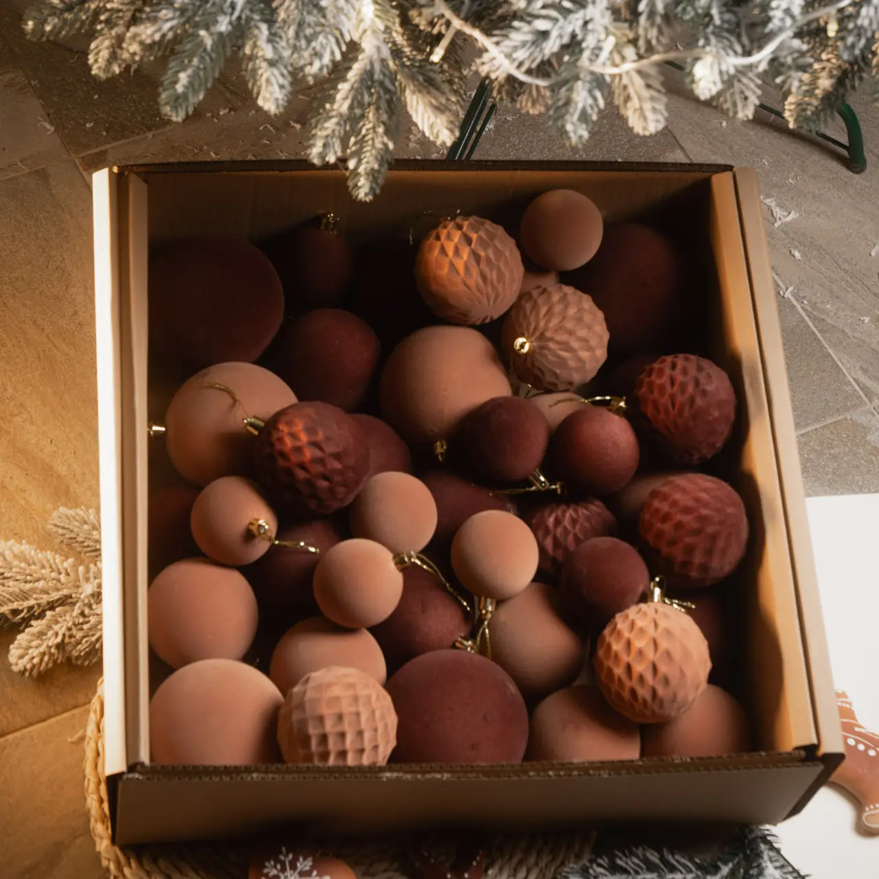 Обирайте свій ідеальний настрій для ялинки! У наборі 40 стильних куль із матовою текстурою та рельєфними деталями. Ви можете зібрати власну комбінацію відтінків — зміксувати кілька кольорів або замовити набір в одному тоні.